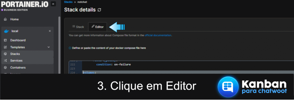 Dentro da página da stack, localize o menu superior e clique na aba Editor para abrir o arquivo de configuração docker-compose.yml.