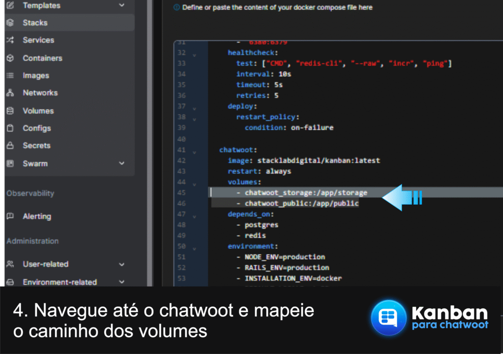 Passo 4: Navegue até chatwoot e mapeie o caminho dos volumes