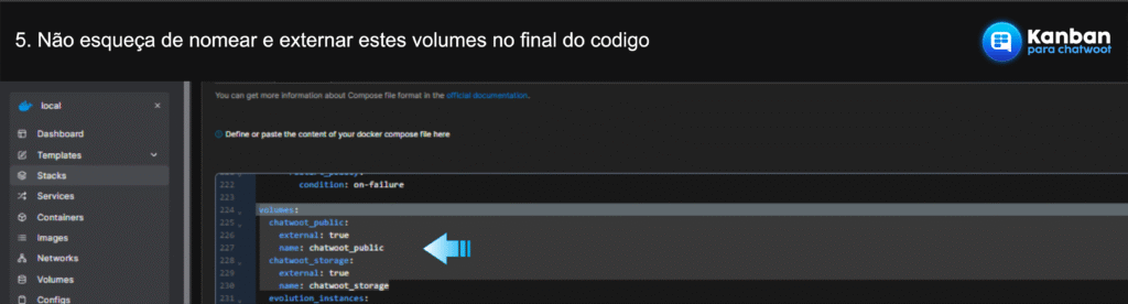 No código, localize o serviço principal do Chatwoot (geralmente base, rails ou web) e, na seção volumes:, adicione a linha de mapeamento: