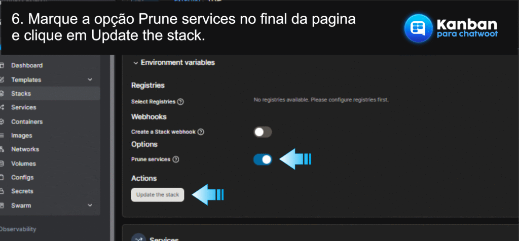 Passo 6: Clique em prune services e update the stack no final da página