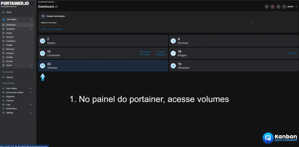 No menu lateral esquerdo do seu painel Portainer, clique na opção Volumes. Isso listará todos os volumes de armazenamento criados para os seus containers.