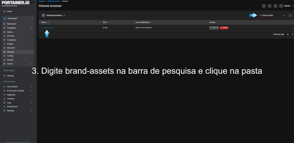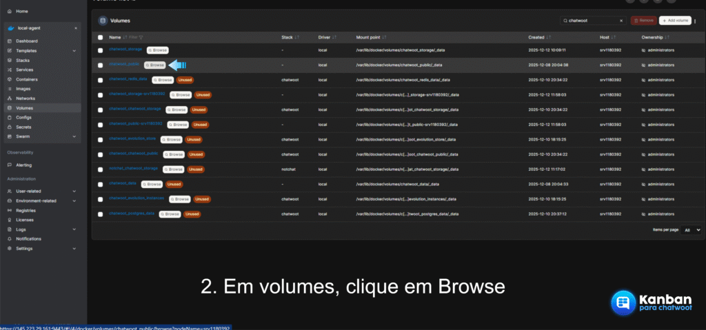 Na lista de volumes, procure por aquele que contém os dados públicos do Chatwoot (geralmente chamado de chatwoot_public). Clique no botão Browse (ícone de lupa) localizado ao lado do nome do volume.