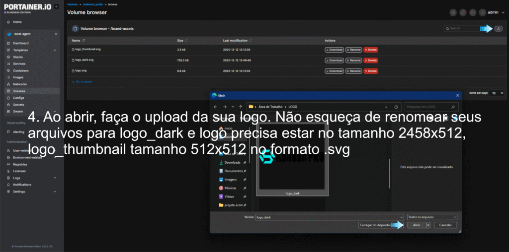 - Substituição: O Portainer pode perguntar se você deseja substituir os arquivos existentes. Confirme para que as logos antigas sejam deletadas.